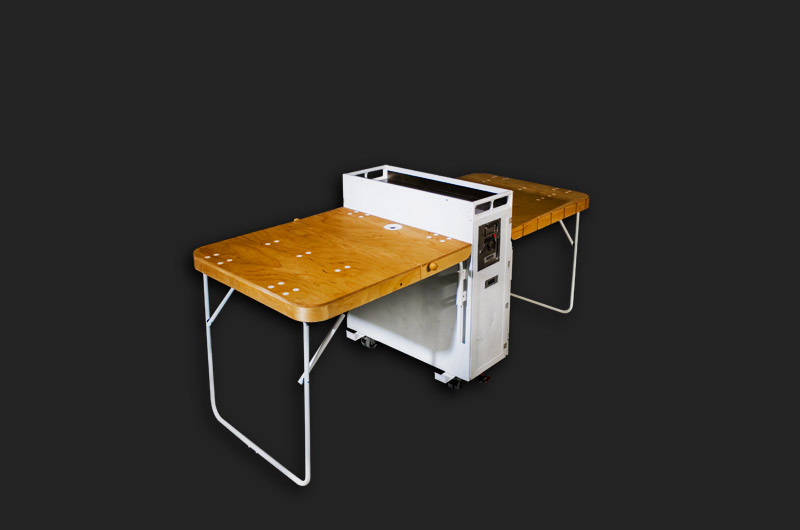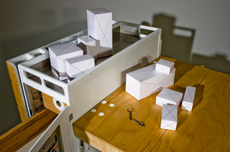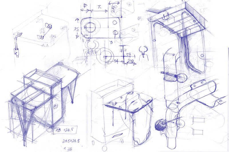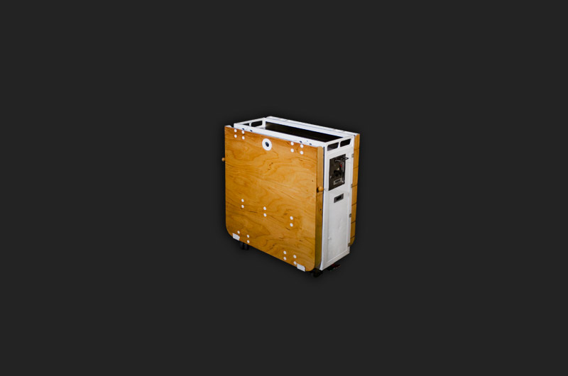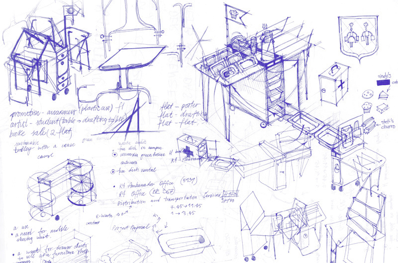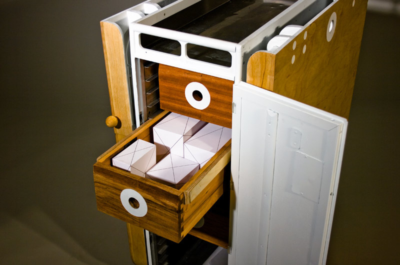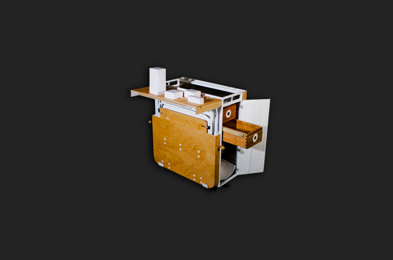 Materials: recuperated VIA rail food trolley, recuperated wood drawers, birch plywood, aluminum tubing.